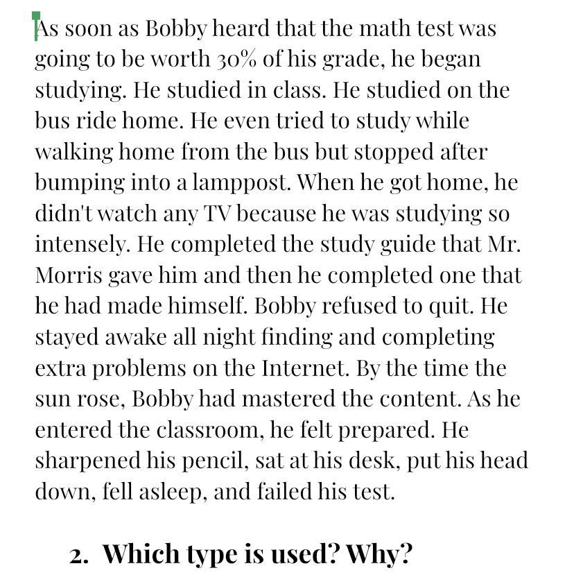 One of the main types of irony, besides verbal and dramatic irony, is the situational irony. In this, a sequence of events does not have the result expect or the result is contradictory. This type of Irony occurs in the excerpt presented because all of the actions of Bobby such as studying on the bus, deciding not to watch Tv to focus on study and completing two different study guides are expected to help Bobby to pass the exam. However, in the end, he falls asleep and fails the test, which is a contradictory and unexpected outcome.