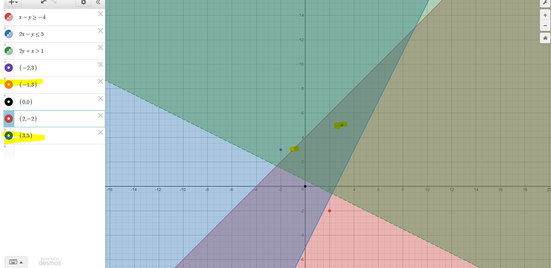 And the inequalities are x-y≥-4, 2x-y≤5, 2y+x>1