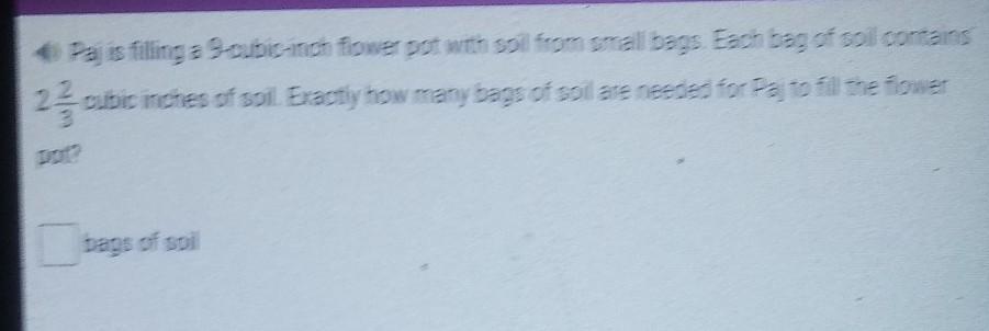 The amount of soil contained in each small bag is 2 2/3 cubic inches. We would convert from mixed number to improper fraction. It becomes 8/3 cubic inches.