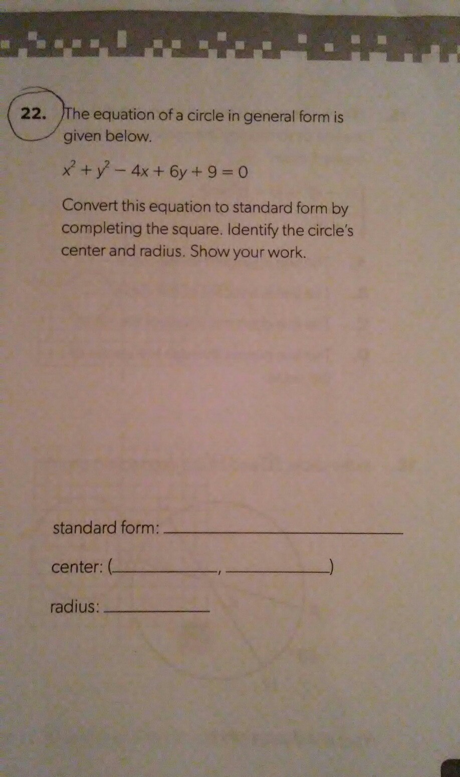 Firstly, shifting the real numbered values or the loose number, in this case it is "9", to the right hand side, since we want an actual numerical value and the radius of circle without complicating and stressing much by using quadratic equations. So: