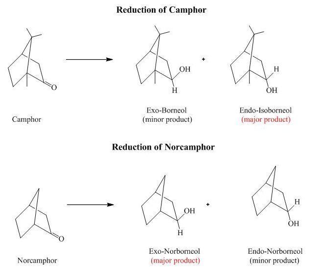Borneol (exo OH group) is synthesized by exo attack of reducing agent but due to steric repulsion of two methyl groups on exo side, the reduction product formed is small and preferentially endo product is formed that is, Isoborneol(with endo OH group).