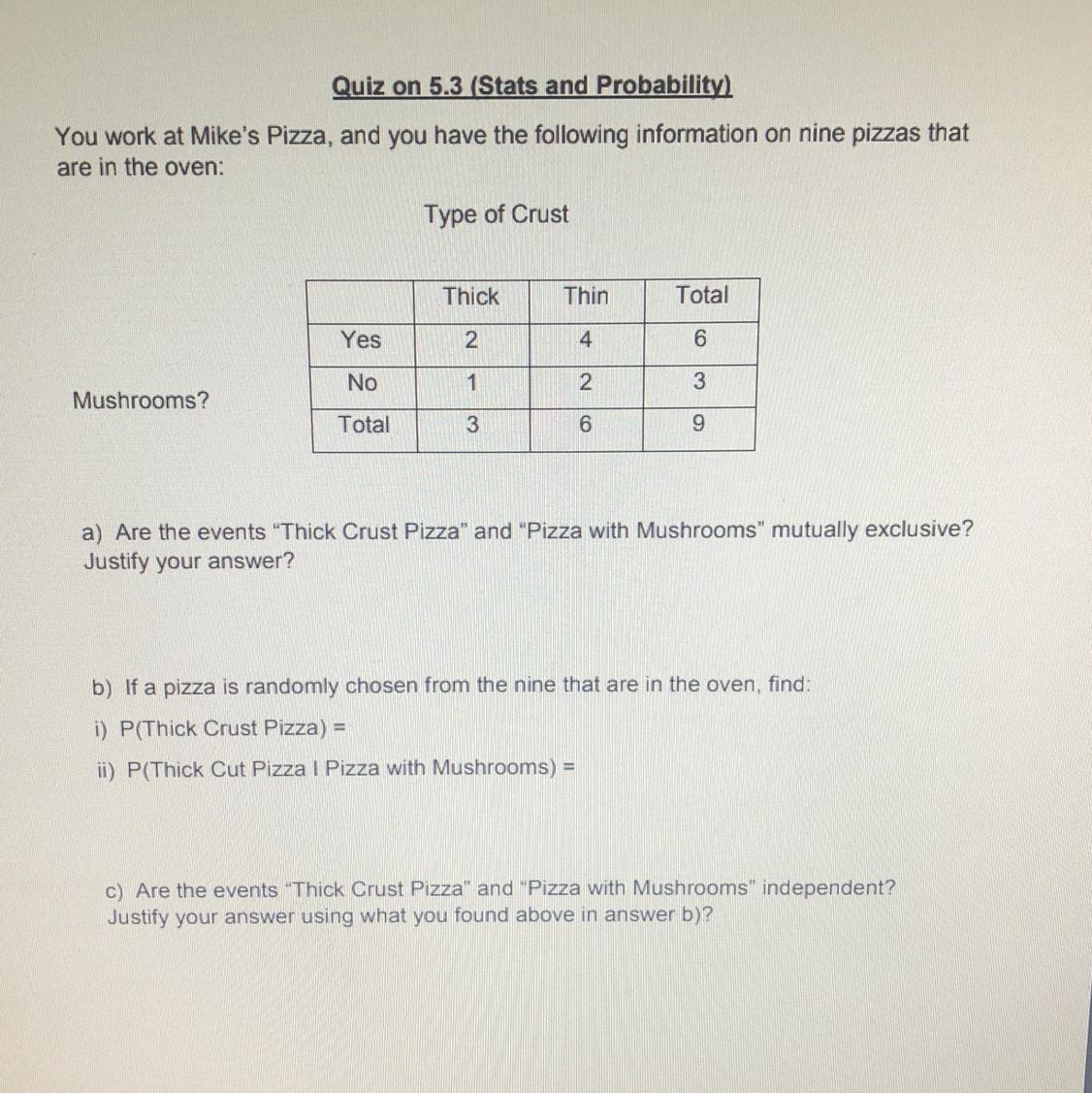 A dependent event is one that will depend on the result before it. Thick crust pizza and mushrooms do not affect each other at all; they do not depend on each other. They both do their own thing. We need to justify with things we found in Answer B. Well, when we added the event of mushrooms our probability decreased. If one of the events depended on the other, the probability would have definitely increased. Therefore, these events are both independent.