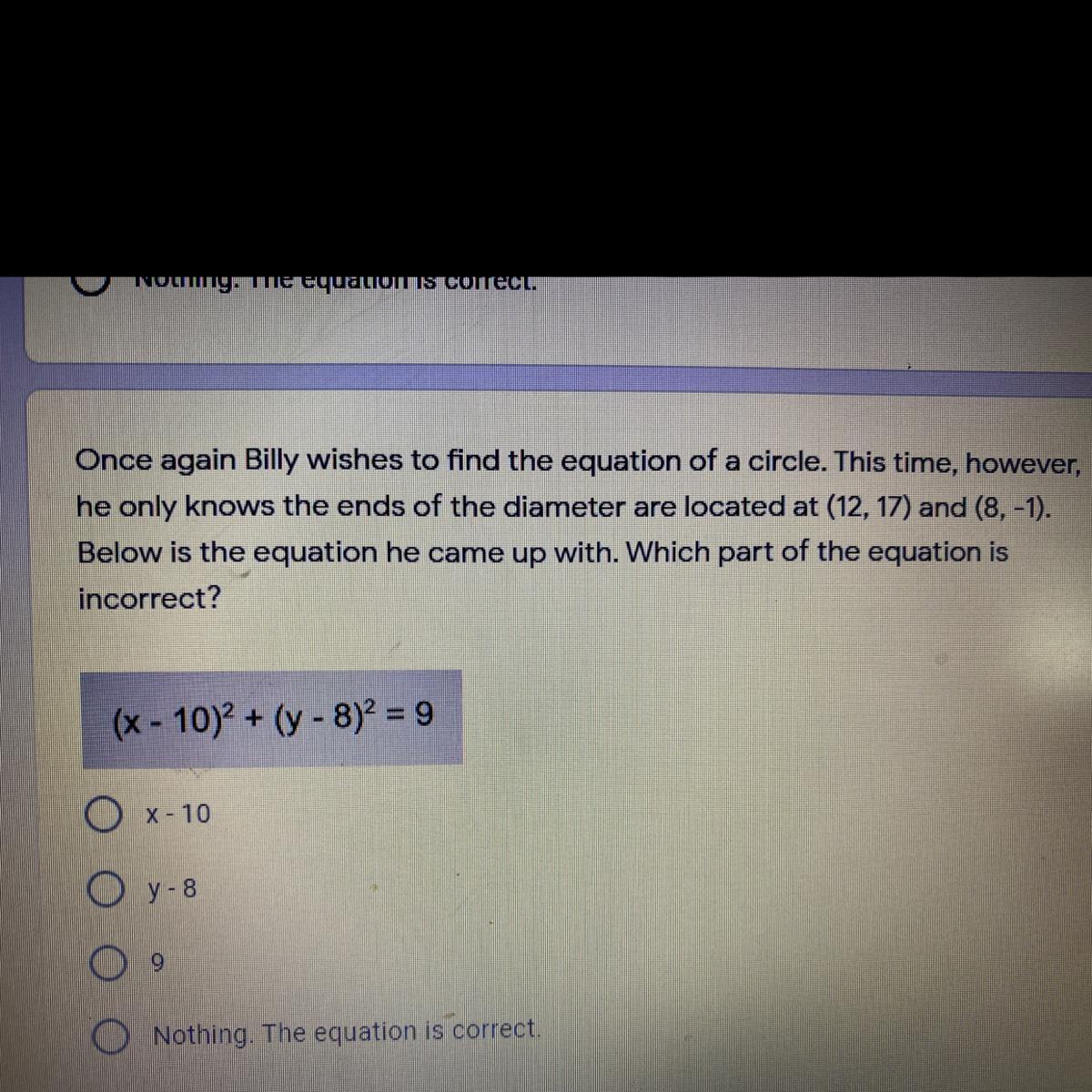 billy wishes to find the equation of a circle. this time however he only knows the end of the diameter are located at (12, 17 )