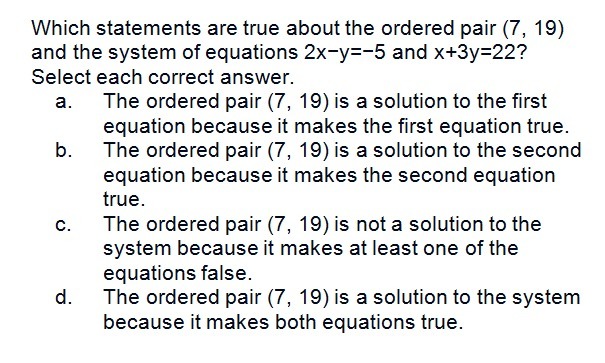 the given point is (7,19). To know whether this point belongs to each of the given lines, we will substitute with the value of x in the line and calculate the corresponding y value. After that we will compare the calculated value with the given one to decide whether the point is a solution to the system or not.
