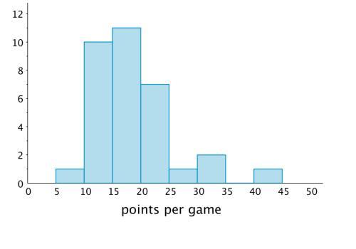 Here is a histogram that shows the number of points scored by a college basketball player during the 2008 season. Describe the s