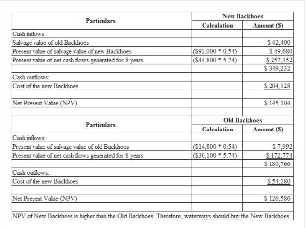 on the rate of return it must pay its owners and creditors. Using that rate, Waterways then uses different methods to determine the best decisions for making capital outlays. This year Waterways is considering buying five new backhoes to replace the backhoes it now has. The new backhoes are faster, cost less to run, provide for more accurate trench digging, have comfort features for the operators, and have 1-year maintenance agreements to go with them. The old backhoes are working just fine, but they do require considerable maintenance. The backhoe operators are very familiar with the old backhoes and would need to learn some new skills to use the new backhoes. The following information is available to use in deciding whether to purchase the new backhoes.