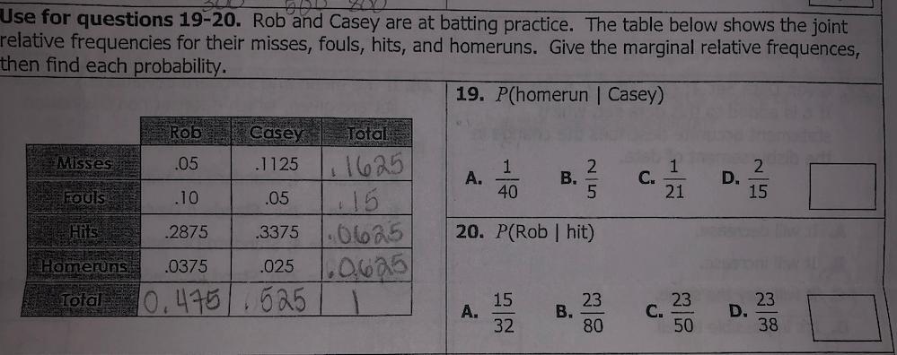 Given the table of probabilities you have to calculate the conditional probability that the result was a homeroom given that Casey was batting.