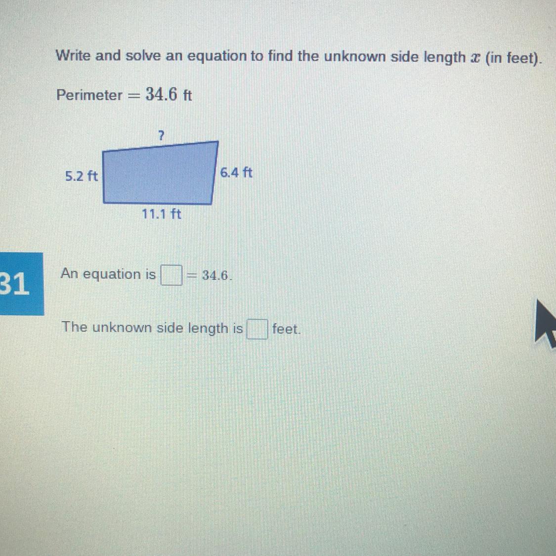 5.2ft + 6.4ft + 11.1ft + xft = 34.6ft \\  |the \:addition \: of \: all \: the \: length \:would \: give \: us \: the \: the \: perimeter \: 34.6ft  |  \\  \\ 22.7ft + xft = 34.6ft \\  |collect \: like \: terms| \\ xft  = 34.6ft - 22.7ft \\ xft = 11.9ft |final \: answer|