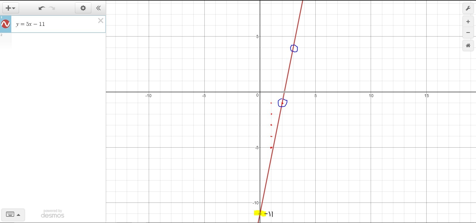 If you look at the graph below, you can see that the correct answer is y=5x-11. The blue circles are the points we were given. The highlighted portion is the y-intercept (b) and the red dots show our slope is 5/1, which can be simplified to 5.