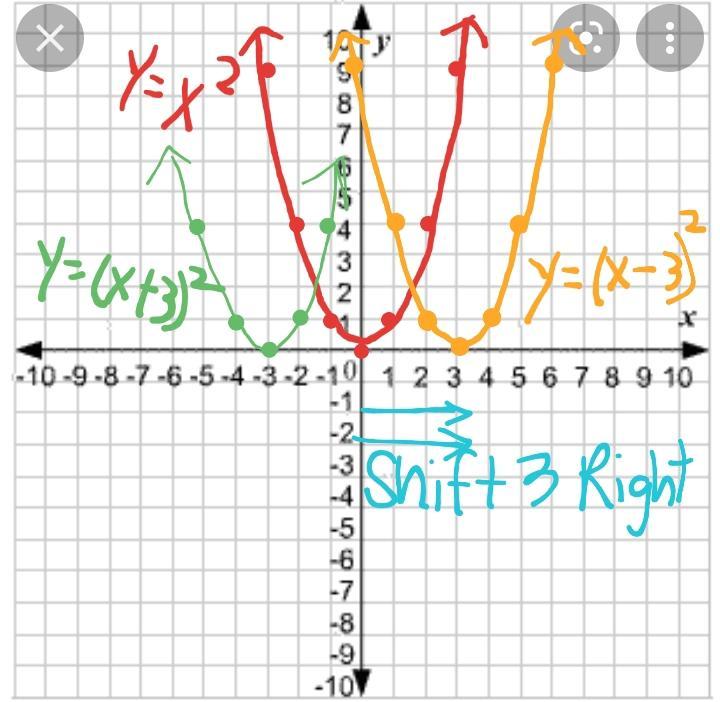 Translation just means shift or slide. To show a LEFT shift in the equation, go in close to the x, inside the parenthesis with the x, for LEFT shift, insert +3.