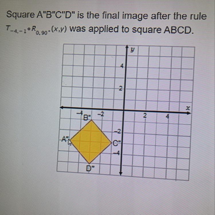 We have the transformed figure, so need to find the inverse transformation. Solving x = -y-4, we find y = -(x+4). Solving y = x-1, we find x = y+1. So to "undo" the translated rotated figure, we need to apply the transform ...
