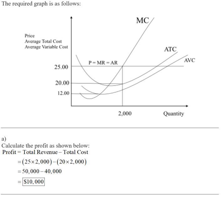 Draw a graph representing a tulip grower’s short-run cost curves (ATC, AVC, and MC curves). On the vertical axis, label the $25.00 price, average total cost ($20.00) and average variable cost ($15.00) of producing 2,000 tulips, and the lowest possible average variable cost of $12.00.