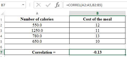 The correlation value of -0.13 lies in the range 0 to -0.30. This implies that the correlation coefficient between the variables number of calories in four meals and the cost of each meal is weak negative correlation.