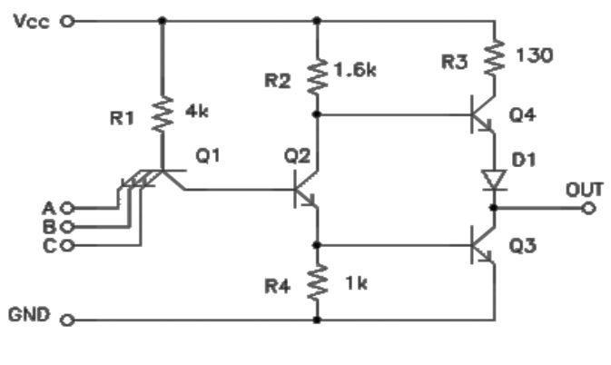 If all of A, B, and C are high (or open), base current is supplied to Q2 through the base-collector junction of Q1. Then Q2 saturates, supplying base current to Q3. Diode D1 ensures that the voltage across Q2 will be insufficient to supply any base current to Q4, so it stays cut off.