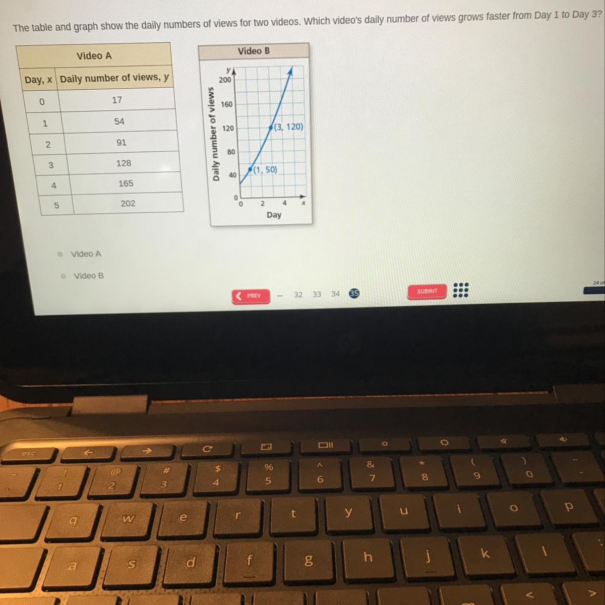 The table and graph show the daily numbers of views for two videos. Which videos daily number of views grows faster from Day 1 t