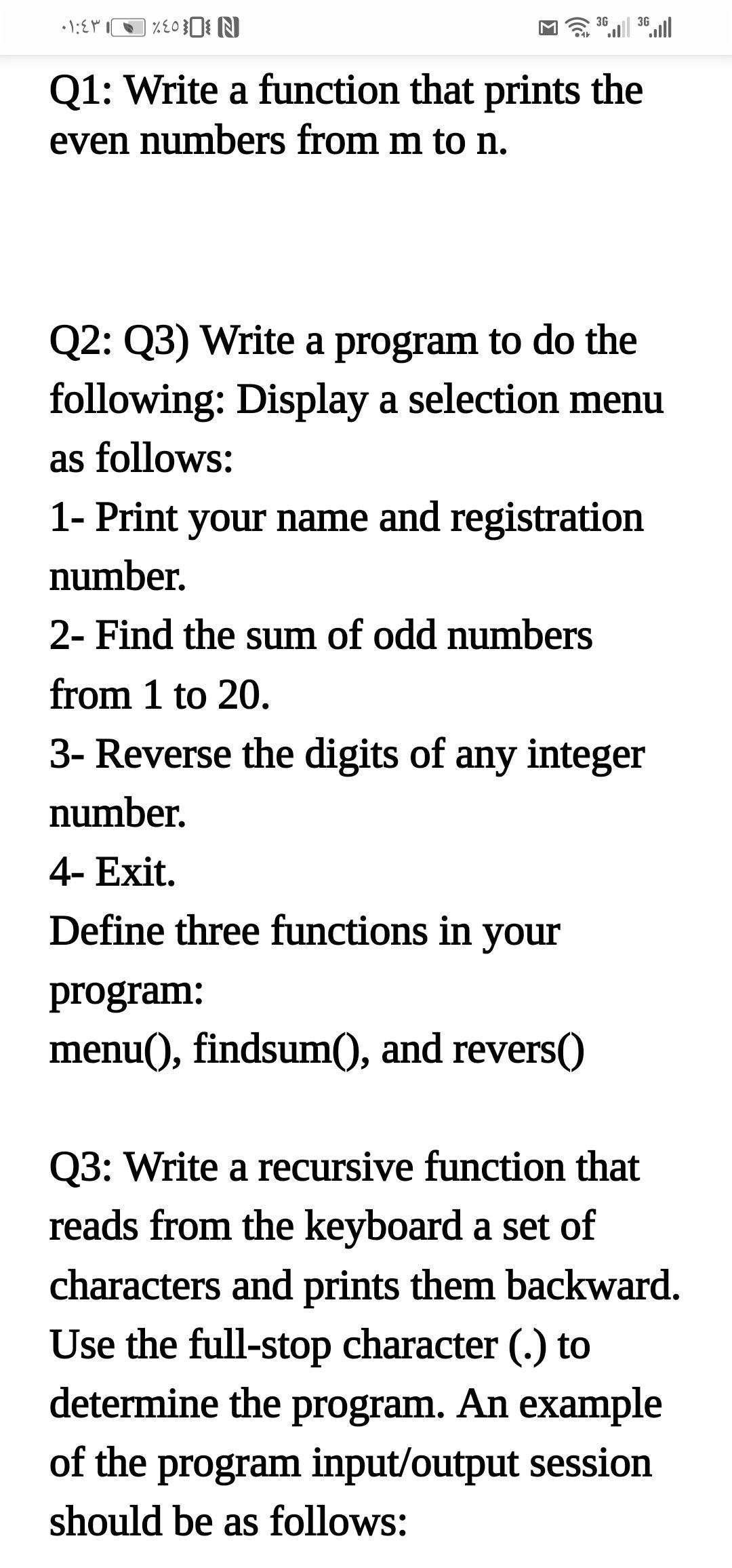 - In question 2, a menu method is declared that prints a list menus in the next line, two methods "findsum() and revers()"is declared, in which "findsum" method is used to add odd values from 1 to 20 and the revers method is used to reverse value from an input digit. In the last line main method is declared, which uses switch to call the above methods.