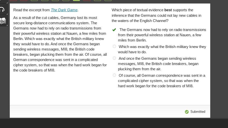 The textual evidence that best supports the inference that the Germans could not lay new cables in the waters of the English Channel is "The Germans now had to rely on radio transmissions from their powerful wireless station at Nauen, a few miles from Berlin."