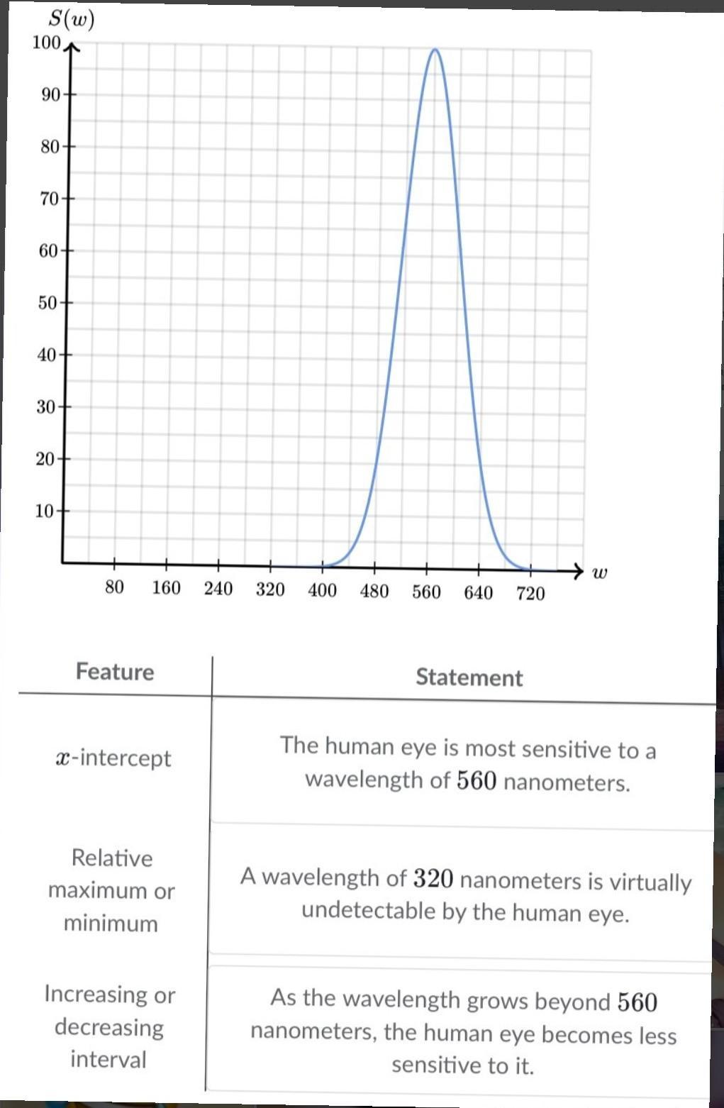 ng it (in percentages) to the highest possible sensitivity. S(w) models sensitivity as a function of wavelength w (in nanometers). Match each statement with the feature of the graph that most closely corresponds to it.​