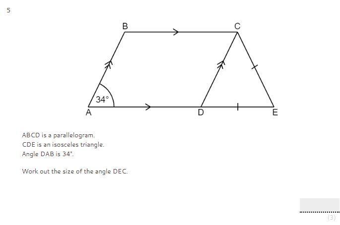 Angle DAB and angle EDC are congruent b/c they are corresponding angles. Triangle CDE is isosceles so angle ECD is congruent to angle EDC.