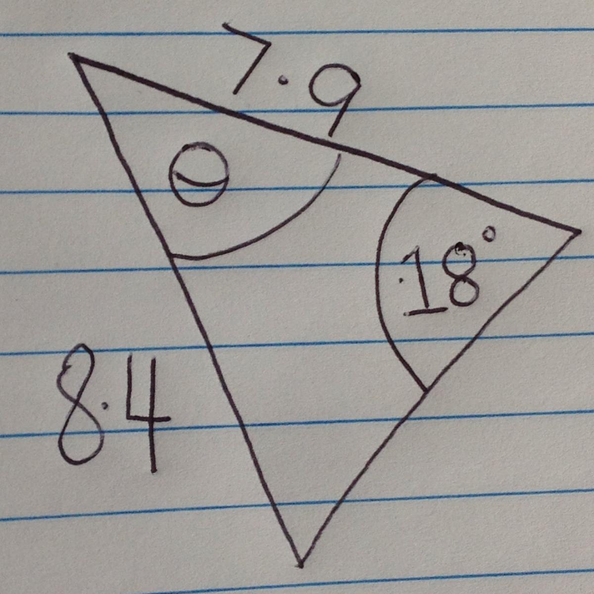 \frac{sin~\alpha }{7.9} =\frac{sin 18}{8.4} \\sin \alpha=\frac{7.9}{8.4} \times sin~18\\\alpha=sin^{-1} (\frac{7.9}{8.4} \times sin18)\\\approx 16 ^\circ 54'\\\theta=180-(18+16^\circ 54')\\=180-34^\circ54'\\=145^\circ 06'