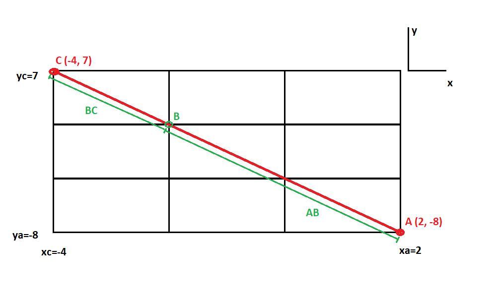 We have to find the coordinates of the point B, that satisfies the condition that the distance AB is 2 times the distance BC.