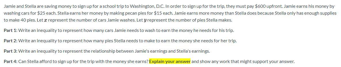 Part 4: Can Stella afford to sign up for the trip with the money she earns? Explain your answer and show any work that might support your answer.