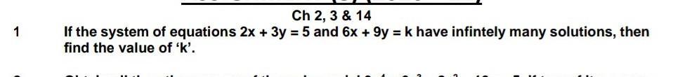 Since the left side of both equations is 6x+9y, k must be 15. k and y can now have infinite solutions, since the top and bottom equations are the same. Hope this helps!