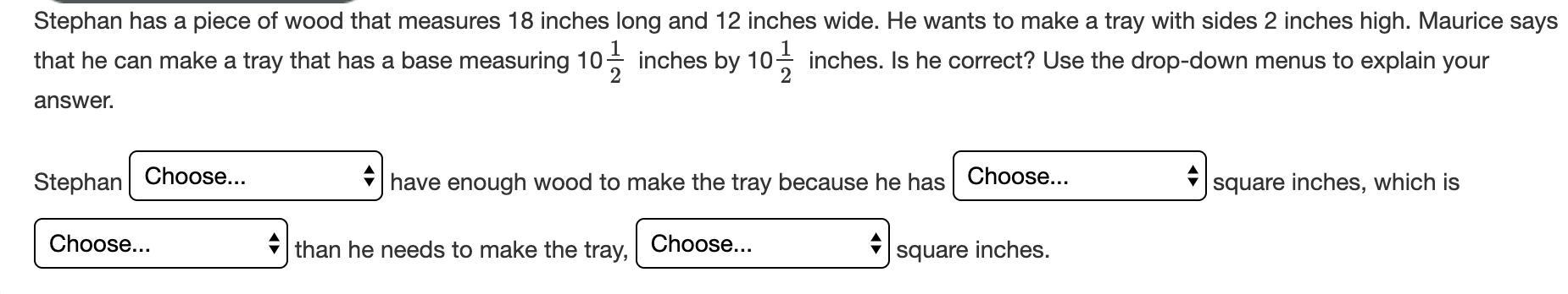 Stephan <u>does</u> have enough wood to make the tray, because he has <u>216</u> square inches, which is <u>more</u> than he needs to make the tray, <u>194.25</u> square inches.