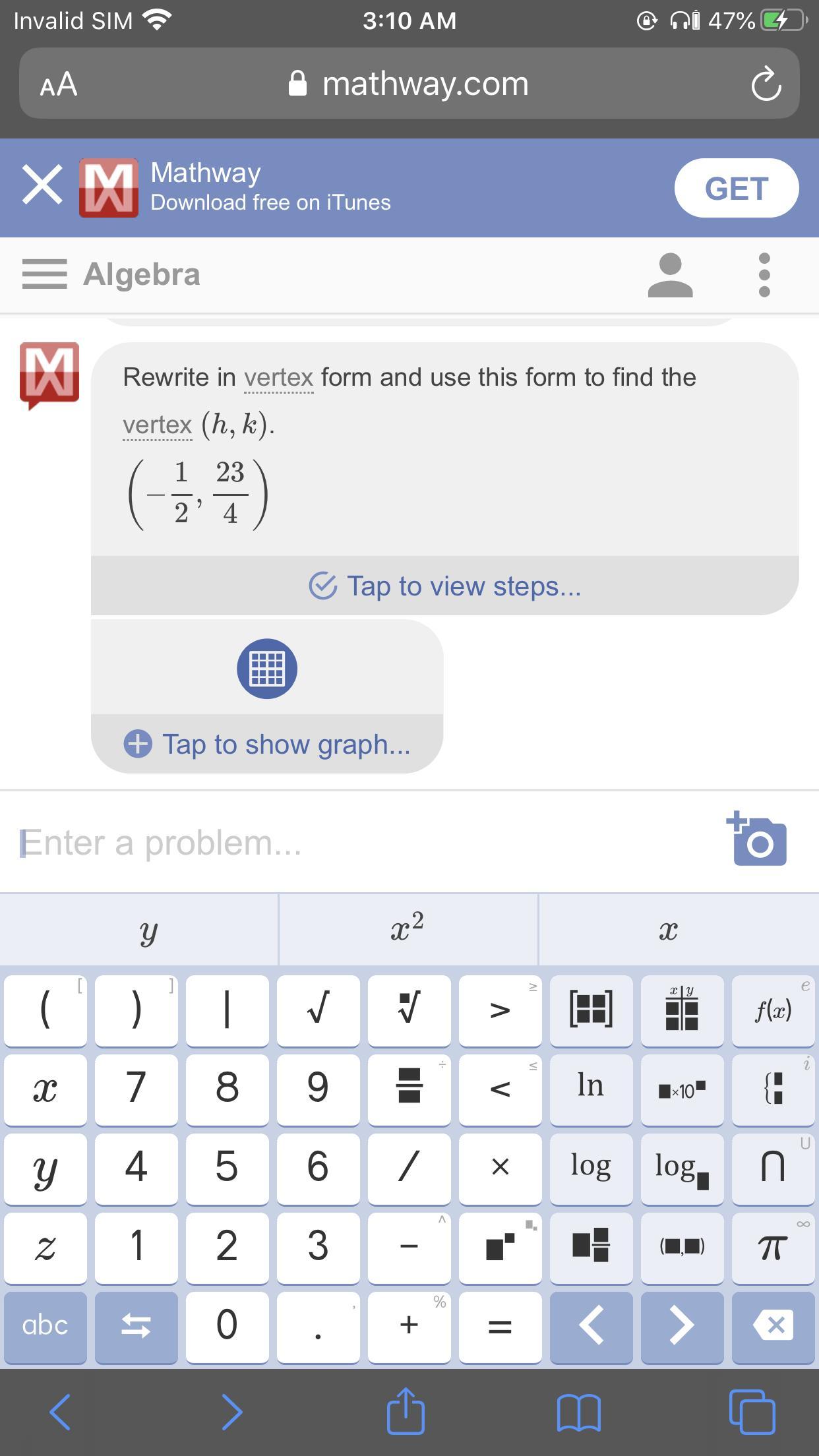 Use a graphing calculator to approximate the vertex of the graph of the parabola defined by the following equation. y=x^2+x+6