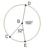 Circle B is shown. Line segments C B, D B, and E B are radii. Angle C B E is 52 degrees and angle E B D is 160 degrees. What is