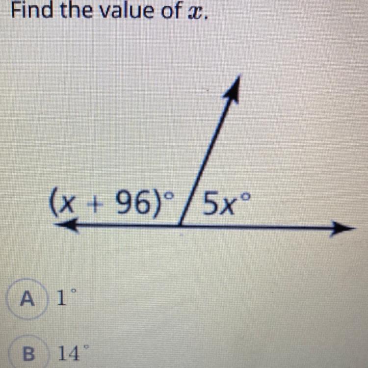 To solve this, you need to make an equation. since a line is equal to 180°, you can add the two angles together. for example, x+96+5x=180. you would write this because these two angles are on a line, which makes the total sum 180°. now you solve: 6x+96=180. 6x=84. x=14°. :)