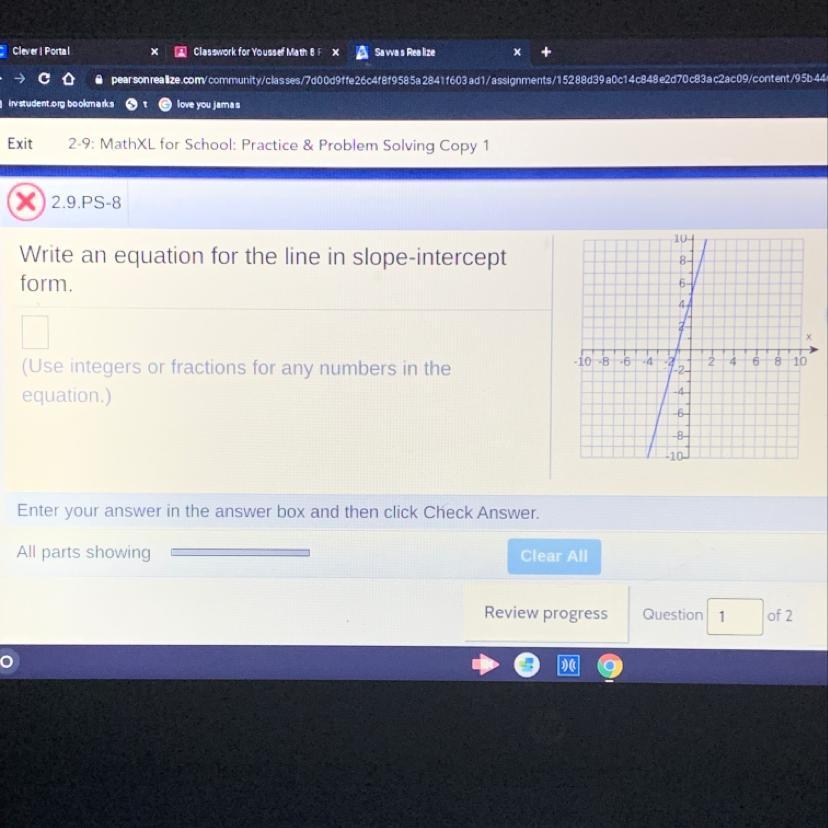 Liner graph, therefore, y=mx+b; b is the y intercept; m is the slope