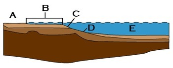 Schematic overview of the transition between the continent and ocean: A = continent; B = continental shelf; C = slope; D = continental level; E = ocean (Abyssal Plain).