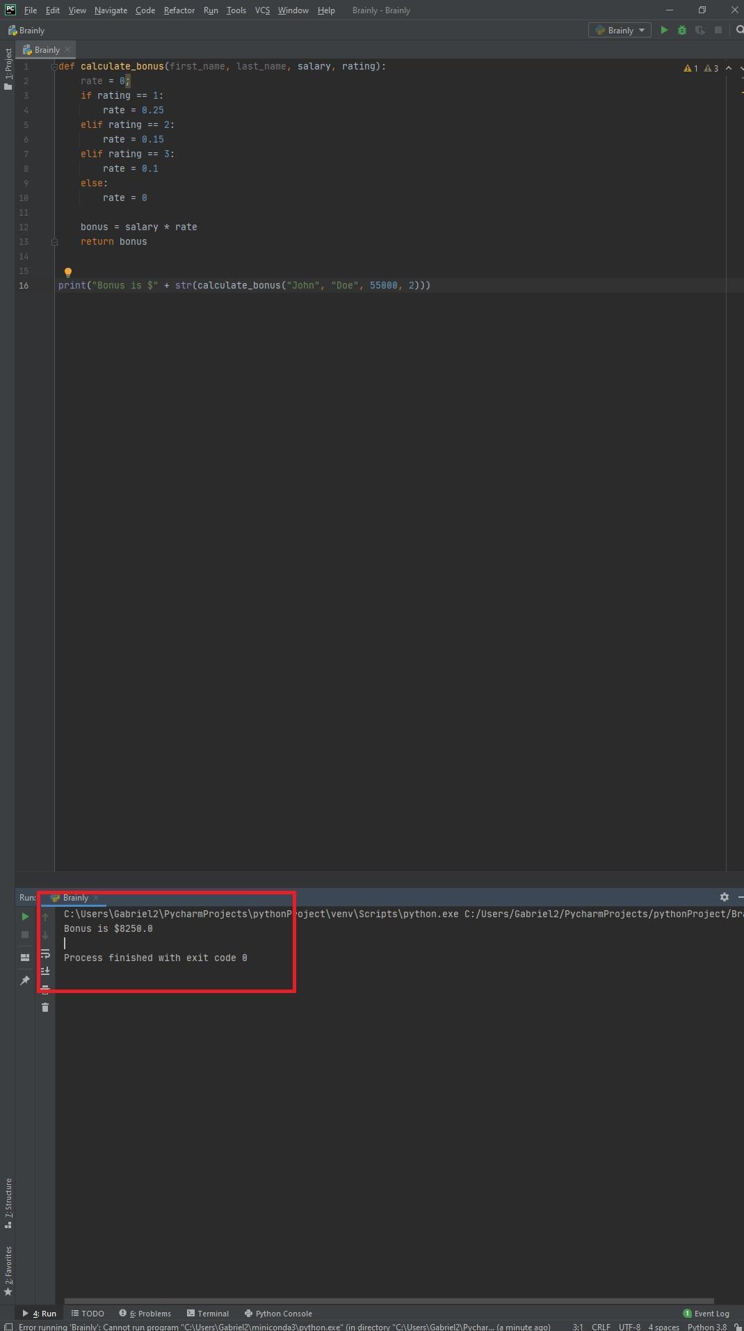 The following code is written in Python. It is a function that takes in the first name, last name, salary, and numeric performance rating of the employee. Then it uses the rating and the salary to calculate the bonus and returns that back to the user. A test case has been created and the output can be seen in the attached image below.