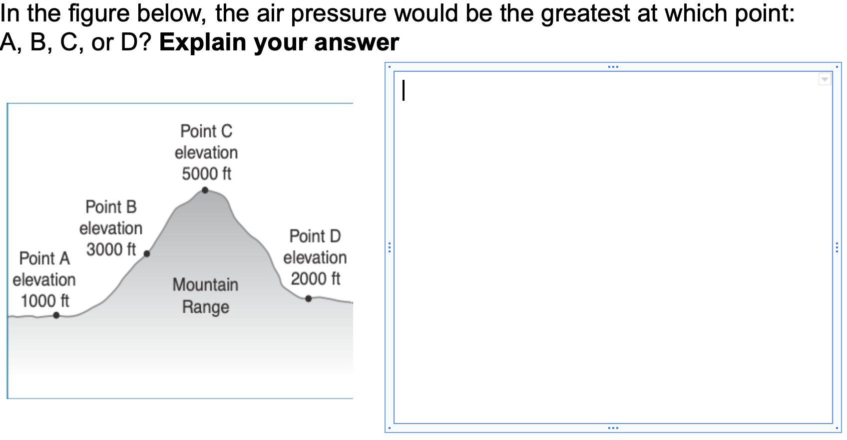 Air pressure is essentially the weight of the air pressing down; it's greatest when there's the most air above, so at the lowest point, which is point A, elevation 1000 feet.