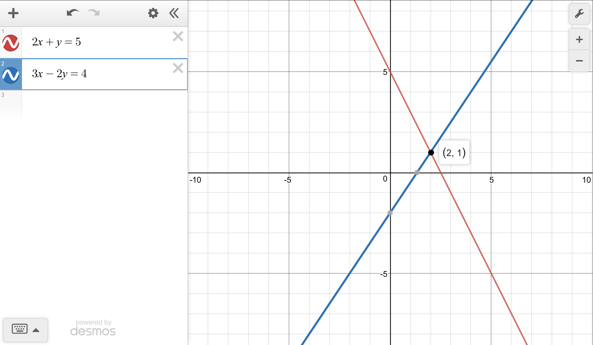 ... <u>Step 5</u>: y = -2·2 +5 = 1 . . . . . find the value of y from x using the expression from step 1. Now, you know the solution is (x, y) = (2, 1).