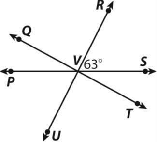 The angle of QVR seems to be a 90 degree angle which is where I got the 90 from then I added it to the 63 and subtracted 180 since QVT is a straight angle the degree would be 180. Therefore, you add 90 and 63 then subtract 180 to get 27 degrees.