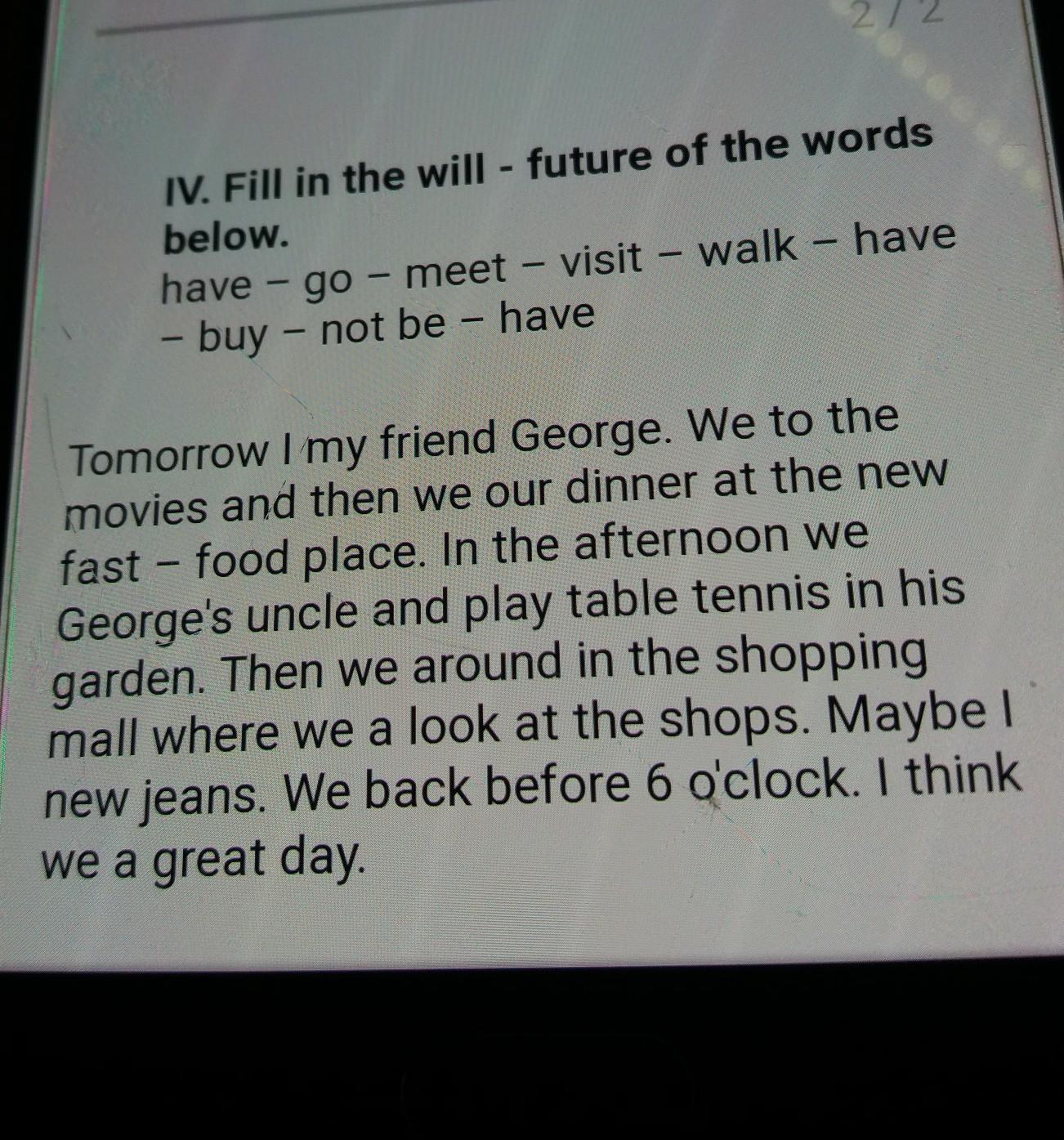 fill in the will- future of the words below. have- go- meet- visit- have- buy- not be- have . ​
