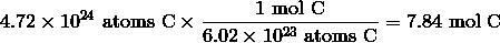 4.72 times 10^{24} text{atoms C} times frac{1 text{mol C}}{6.02 times 10^{23} text{atoms C}}=7.84 text{mol C}
