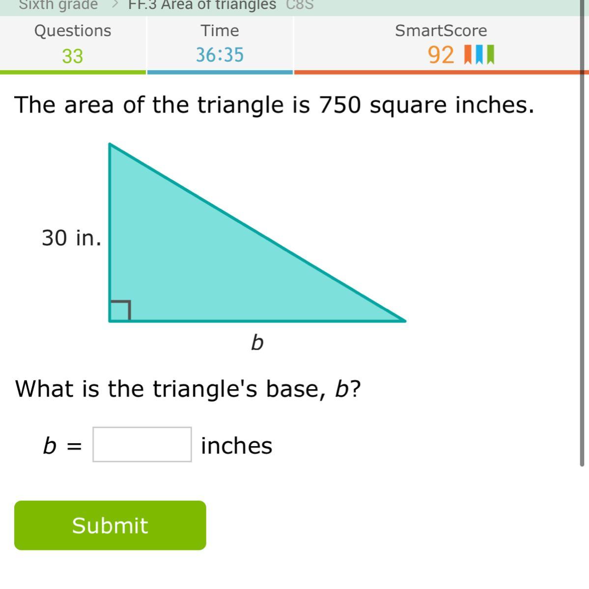 Since the formula for the area of a triangle is bh/2, where b is the base and h is the height, you can set up the following equation: