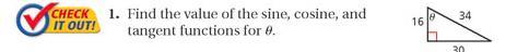 1. sine = opposite / hypotenuse = 30 / 34 = 15 / 17