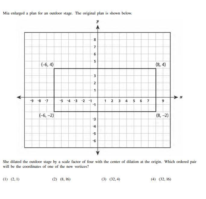 She dilated the outdoor stage by a scale factor of four with the center of dilation at the origin. Which ordered pair