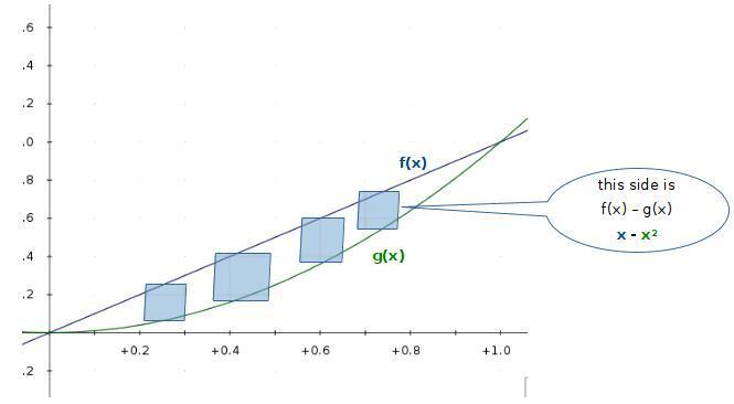 thus, if one side on the square is x - x², then the area for the square is (x - x²)(x - x²), or (x - x²)²