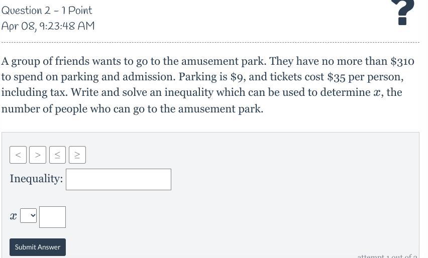 310 >_ (greater than or equal to) 35x + 9