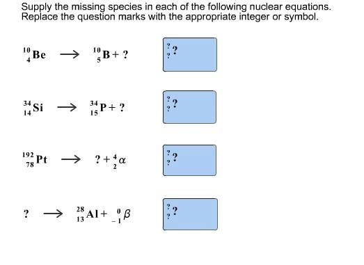 1. In the first equation, Beryllium-10 isotope undergoes beta-decay, emitting a beta-particle to form boron-10 isotope. The balanced nuclear equation is given below: