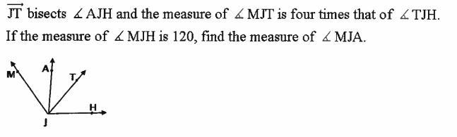 JT bisects AJH and the measure of MJT is four times that of TJH. If the measures of MJT is 120 find the measure of MJA.