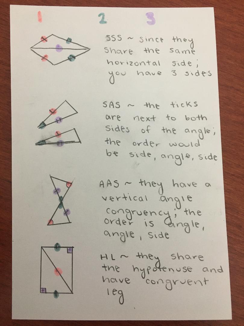 To do this problem, look at the angles that are marked congruent as well as the sides. Then look at the order that the angles and sides are placed. If it is SSS, then that means three sides are marked congruent. SAS means the order of the side and angles would be side then angles then another side. AAS means angle then angle then side. HL is when you have a right triangle and one of the legs are congruent as well as the hypotenuse. ASA means an angle then side then another angle.