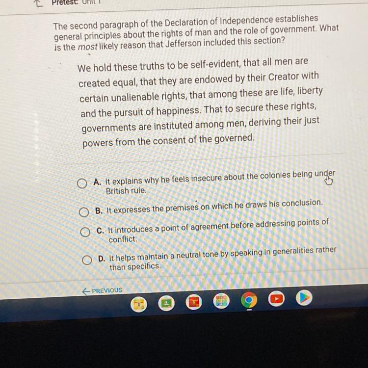 The Declaration of Independence was a document in which the thirteen colonies declared themselves independent from the Kingdom of Great Britain. This statement was made by various intellectuals (including Thomas Jefferson) who drew on the ideas of the Enlightenment and the principles of liberty, equality, and the pursuit of liberty. In the second paragraph, Jefferson establishes the main ideological premises of the Declaration of Independence such as "We hold these truths to be self-evident, that all men... are endowed by their Creator with certain unalienable rights, that among these are life, liberty, and the pursuit of happiness". So the correct answer is B.