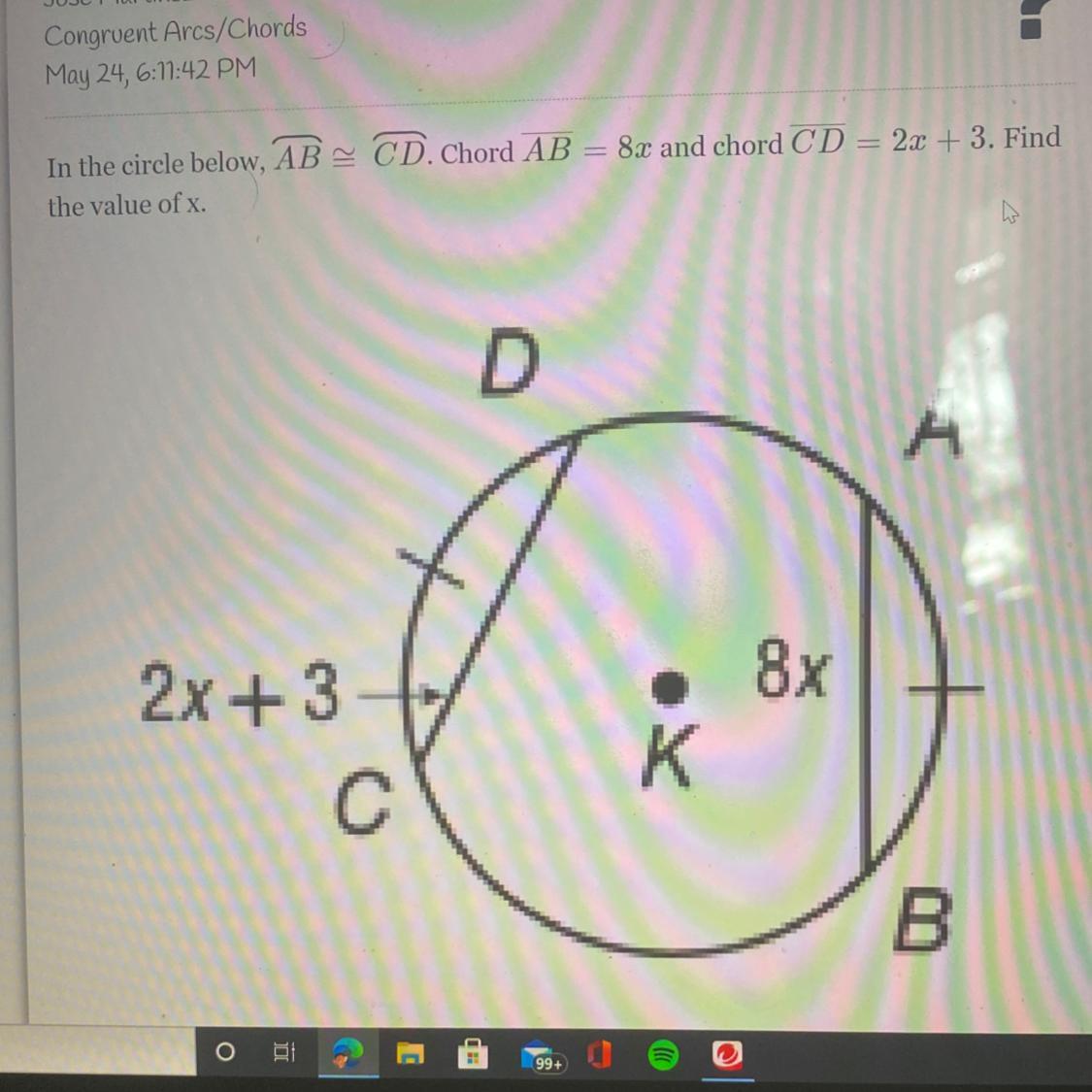 In the circle below, AB=CD. Chord AB = 8x and chord CD = 2x + 3. Find the value of x.