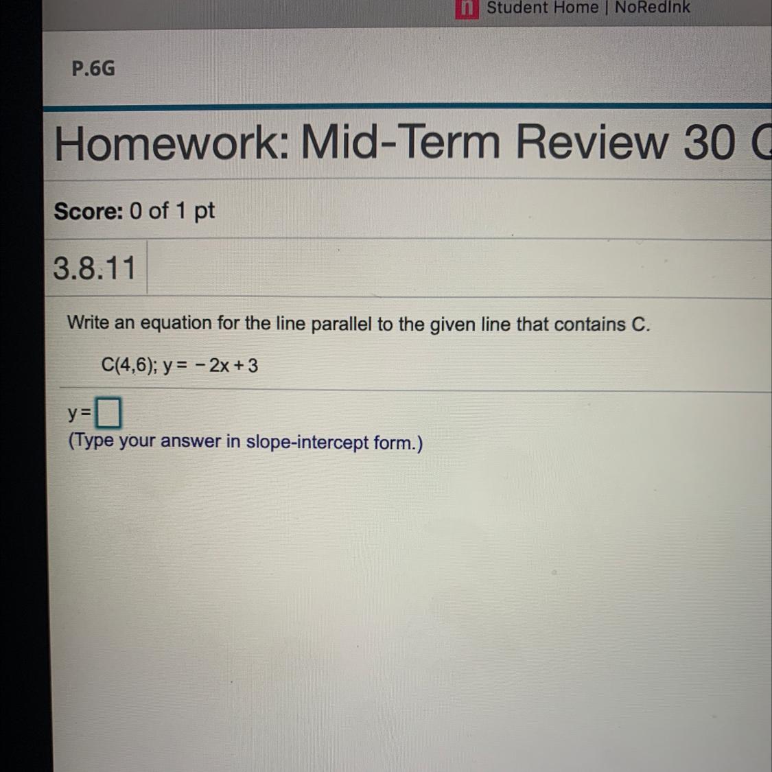 When there is a parallel line, it means that the slopes are the same but the y-intercepts are different. Since you already have the coordinate with x and y and the slope, all you need to find is such y-intercept. So, you would use point-slope form aka y - y1 = m(x - x1). Replace y1 with 6 and x1 with 4 since in (4, 6), x=4 and y=6, and replace m with -2 since its the slope. Now all you have to do is solve it out and you get the result y = -2x +14.